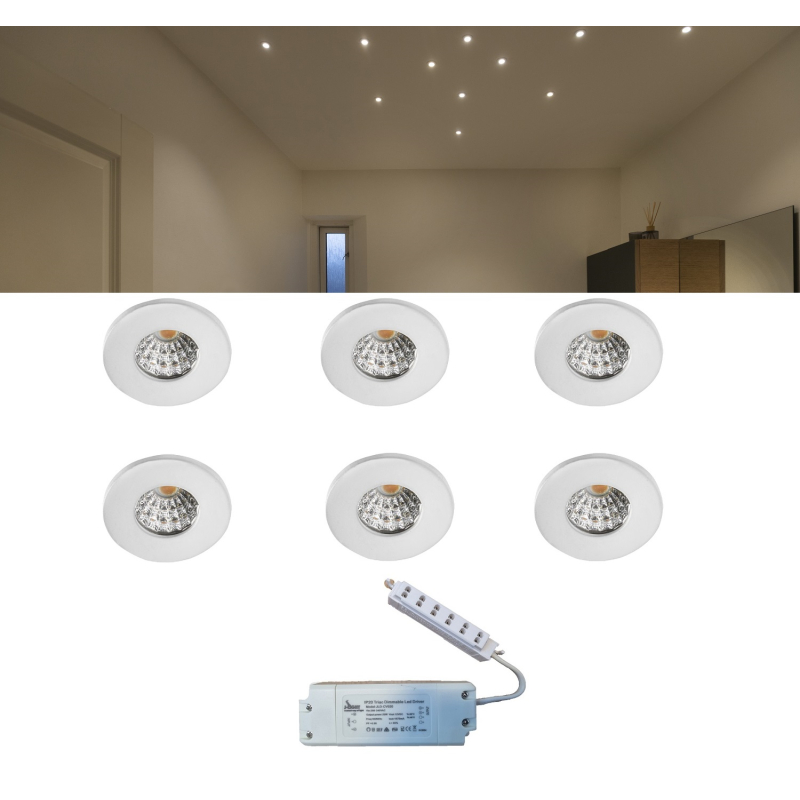 Dette elegante og kompakte sæt indeholder 6 stk. IBIS mini LED spots, som er perfekte til mange forskellige anvendelser, såsom stjernehimmel belysning, gangarealer eller badeværelset, da spottene har en IP44 klassificering, som gør dem velegnede til brug i fugtige områder, så som på badeværelset. Hver spot yder hele 240 lumen, og leveres med 4 meter tilslutningskabel til medfølgende driver.