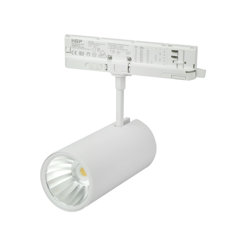 Skinnespotten har indbygget justering af både watt og farvetemperatur direkte på driveren, så du kan optimere både lysniveau og stemning i rummet.