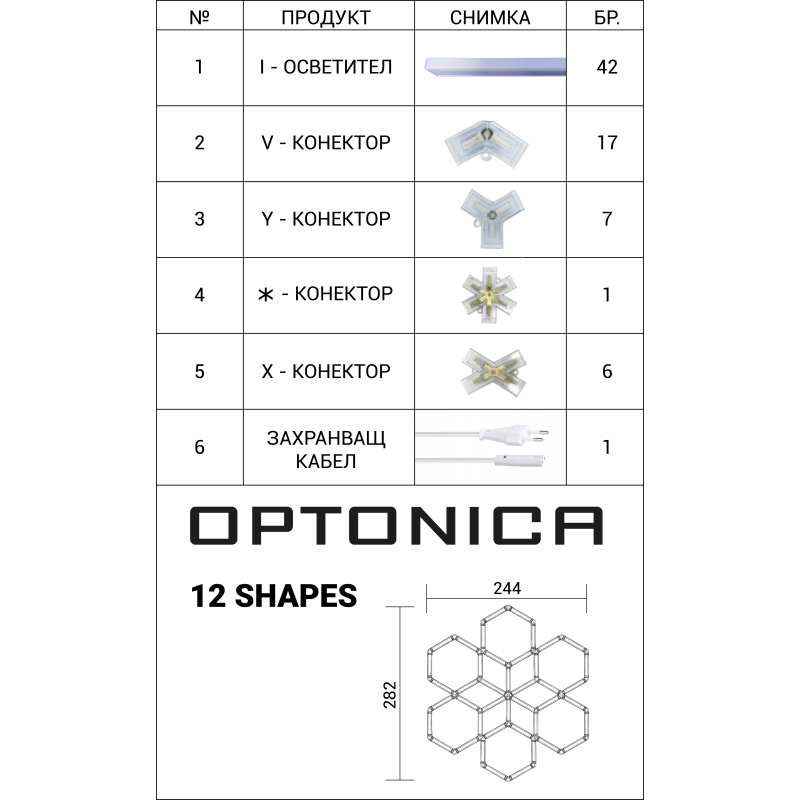 Ifølge produktoversigten indeholder sættet 42 lysmoduler, 17 V-konnektorer, 7 Y-konnektorer, 1 stjerne-konnektor, 6 X-konnektorer samt 1 strømkabel. Det gør systemet komplet til den viste opbygning og sikrer en fleksibel og stabil samling ved installation.