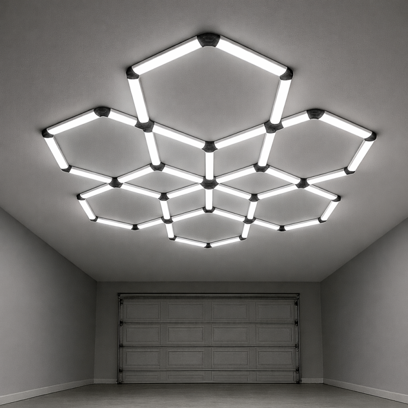 Dette hexagon lyssystem består af 12 sammenbyggede felter og måler ca. 2440 x 2820 mm i den viste opsætning. Det giver en stor oplyst flade, som fungerer ideelt som primær loftsbelysning i fx garage eller værksted. Med en samlet lysstrøm på 35.280 lumen opnås et kraftigt og jævnt arbejdslys, der reducerer skygger og giver gode arbejdsforhold.