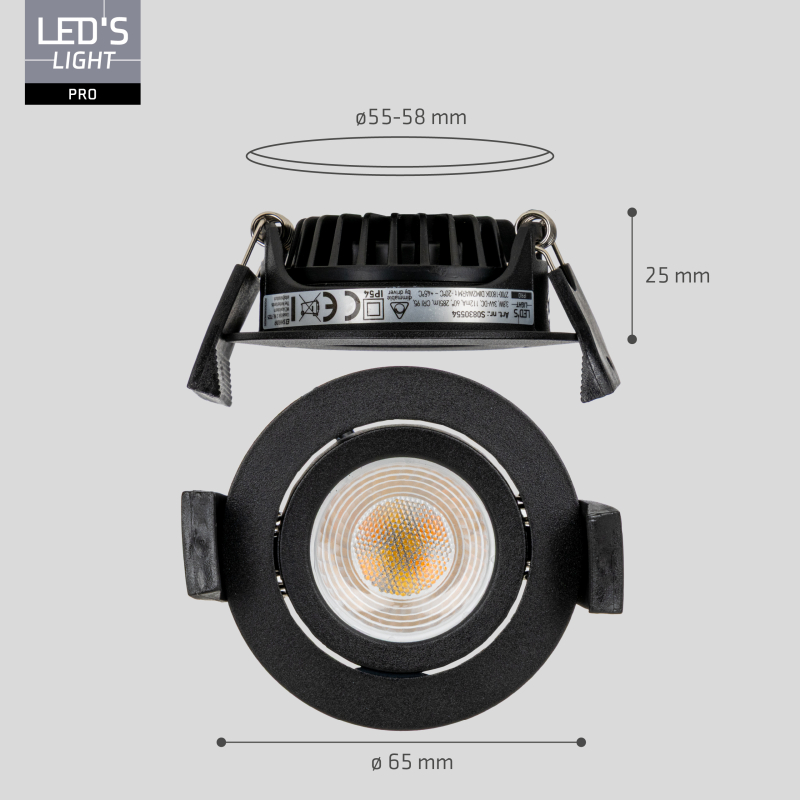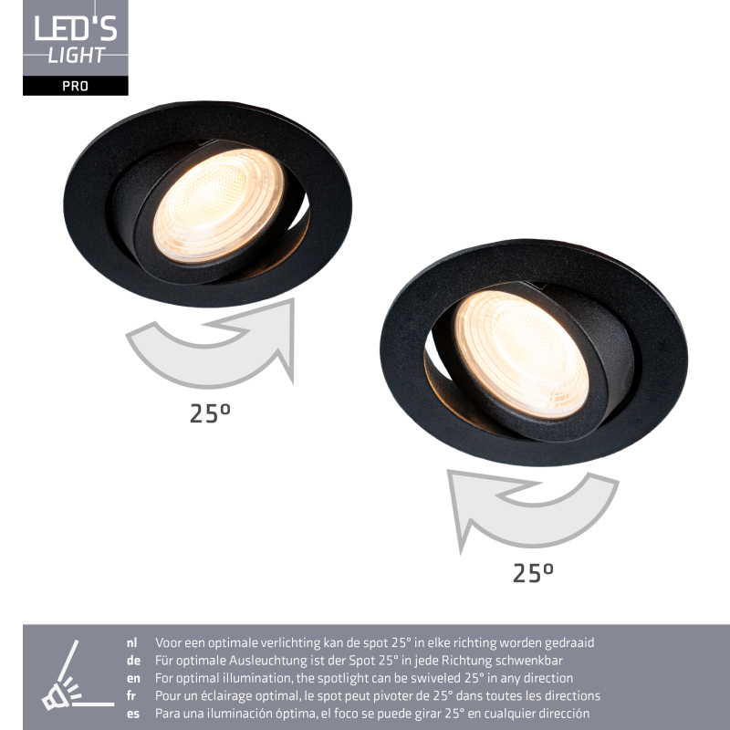 Spottet har en lys spredningsvinkel på 60° og kan vippes 25°, så du nemt kan rette lyset mod fx vægge, billeder, nicher eller arbejdszoner. Det er samtidig dæmpbart med de fleste LED lysdæmpere – også SMART HOME løsninger, der understøtter Triac dæmpning.