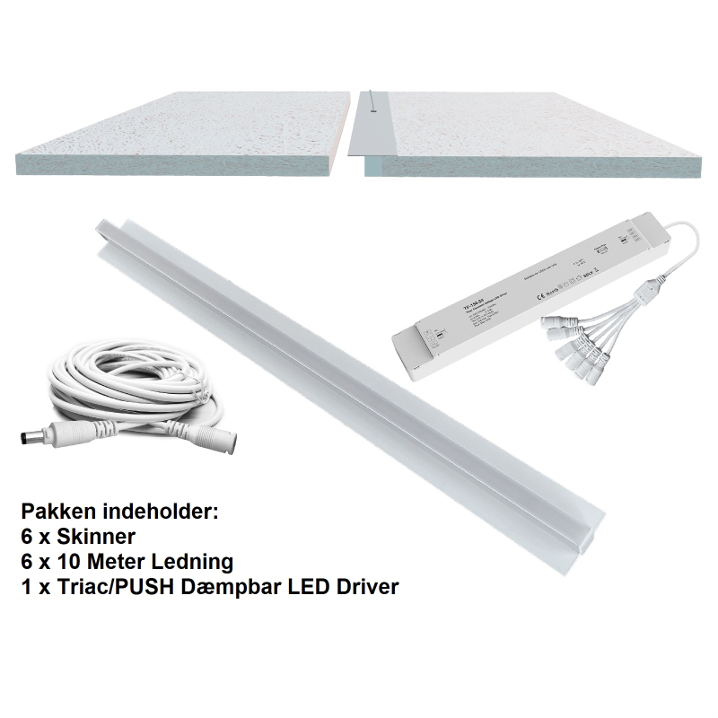 - Komplet pakkeløsning med 6 lysskinner, kabler og dæmpbar driver