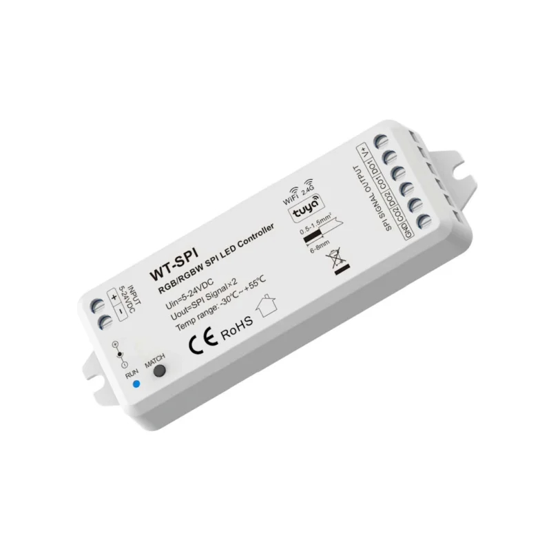 SPI WiFi Tuya & RF Controller 5-24V er den perfekte løsning til nemt at styre dine RGB IC og RGBW IC LED-strips. Denne digitale kvalitetscontroller kan hurtigt forbindes med dit eksisterende WiFi-netværk og styres via Tuya Smart eller Smartlife app’en, hvilket giver dig fuld kontrol over belysningen direkte fra din smartphone. Desuden kan controlleren tilføjes til Google Home, så du kan stemmestyre dine lyskilder via Google Assistenten.