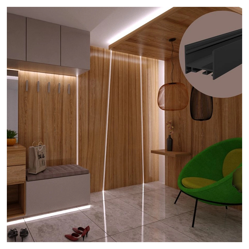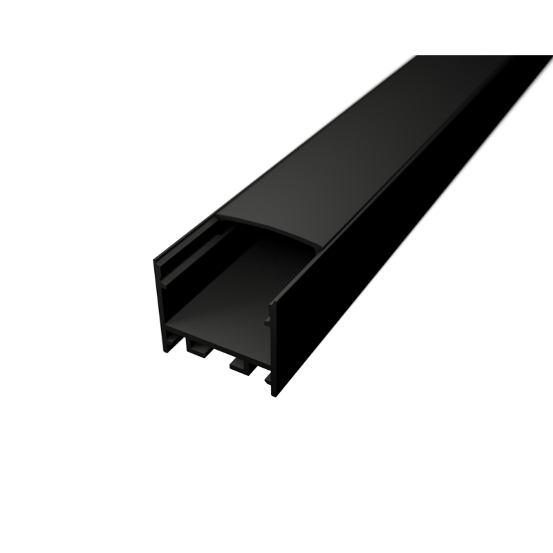 Få et elegant og professionelt lysudtryk med SURFACE 12 alu profil i sort, med opal sort cover – en robust og alsidig profil, der både kan anvendes til overflademontering og indbygning i lofter. Den brede profil passer til LED strips på op til 20 mm, hvilket giver mulighed for kraftigere belysning eller dobbelte LED strips.
