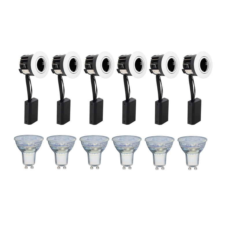 Komplet pakkeløsning med 6 stk. Lyra indbygningsspots inkl. dæmpbare GU10 LED pærer.