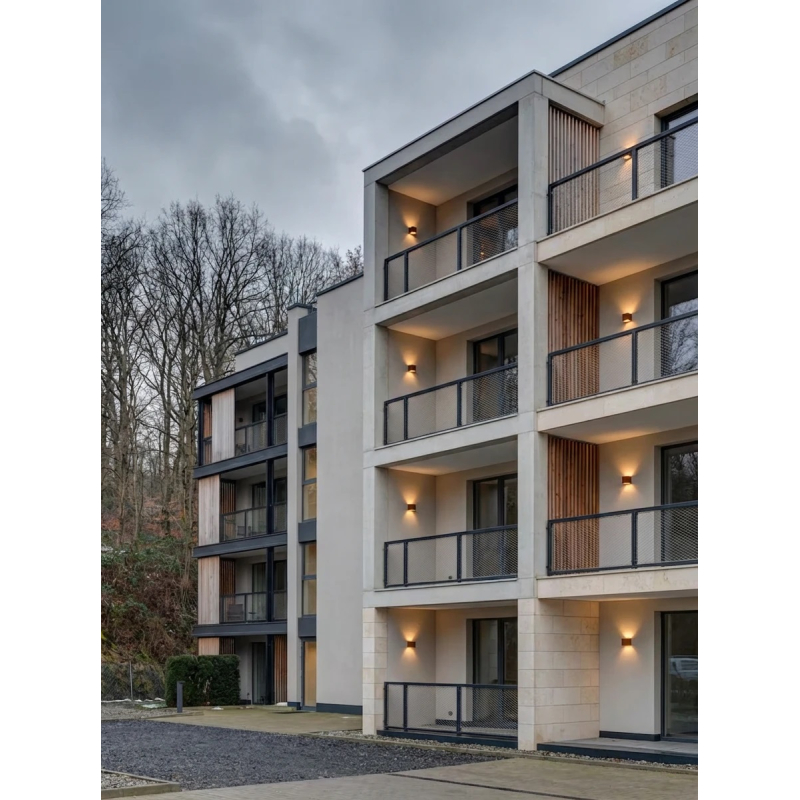 Den cortenfarvede overflade giver denne version af CUBE væglampen et varmere og mere eksklusivt udtryk end den klassiske sorte model. Farven passer særligt godt til facader i beton, træ, tegl og mørke metaloverflader, hvor lampen både fungerer som belysning og som en del af det arkitektoniske udtryk.